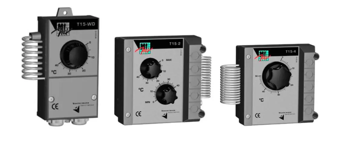 Met de T15-serie kan apparatuur (ventilatoren, verwarming, alarm) gebaseerd op een ingestelde temperatuur in- en uitgeschakeld. De mechanische thermostaat T15-4 maakt, in combinatie met een Mf-Net transformator, de temperatuurgestuurde regeling van ventilatoren mogelijk. De thermostaten van de T15-serie zijn voor éénfase toepassingen.