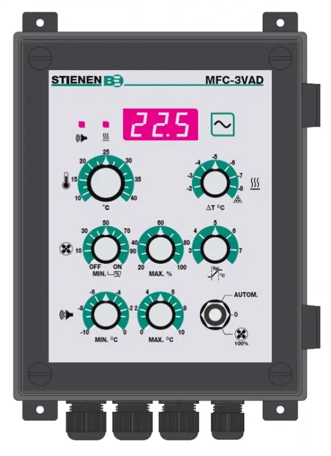 De ventilatorregelaar MFC regelt de aangesloten ventilatoren zodanig dat de ingestelde temperatuur gehandhaafd blijft. Het meten van de temperatuur geschiedt middels de bijgeleverde temperatuursensor die in de ruimte geplaatst dient te worden.