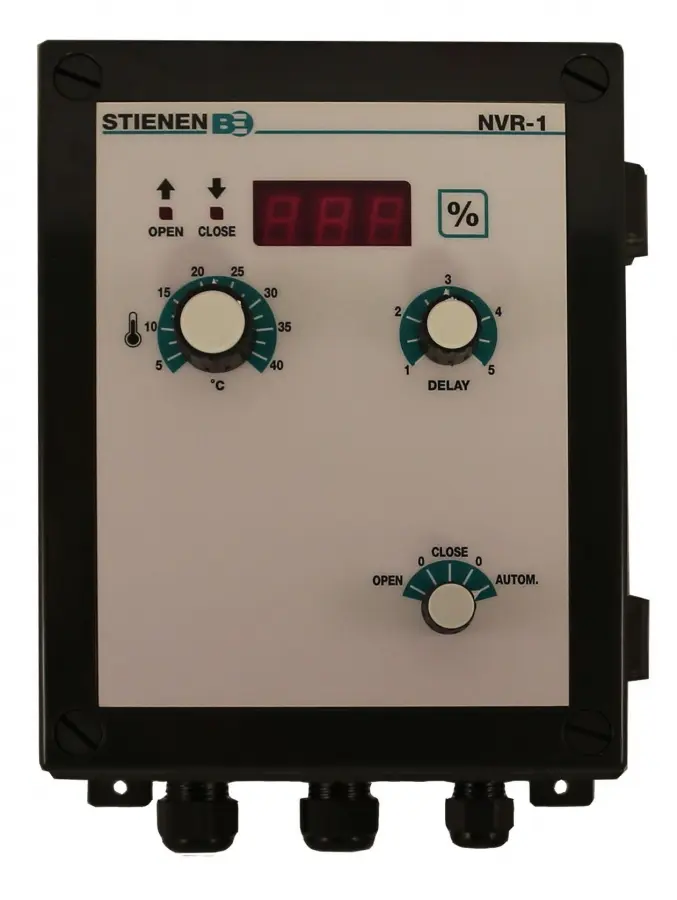 De NVR regelt de ventilatiekleppen of -gordijnen ana de hand van de ingestelde temperatuur. Mocht de staltemperatuur onder de ingestelde waarde komen, zorgt deze regelaar dat de kleppen of gordijnen verder sluiten. In geval van een temperatuurstijging gebeurt het tegenovergestelde